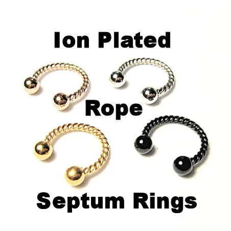 16ga x 5/16’’ 316 L Surg.Steel Circular Barbell/ Horseshoe Twisted Rope Style, Ion Plated in, Gold Plate, Black, Rose GP, and Polished Steel, perfect septum size.