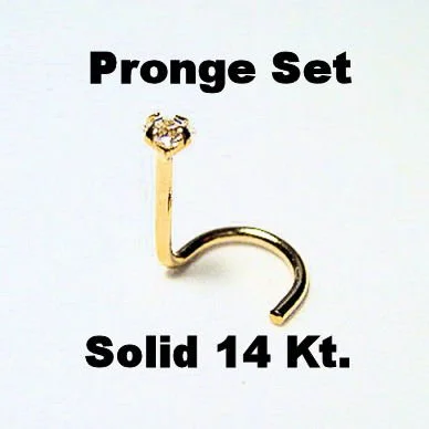 Solid 14 Kt. Gold Nose Screw w Prong Set Gem, Clear Gem Only