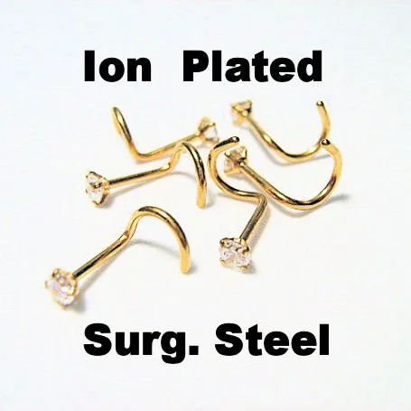 18ga 316L Surg. Steel Nose Screw, Ion Plated Yel-Gold Plated w 2.5 Pronge Set Gem , Clear Gem Only.