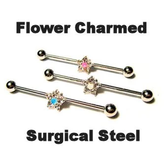 316 L Surgical Steel Polished Industrial w Gemsyone Flower Charm